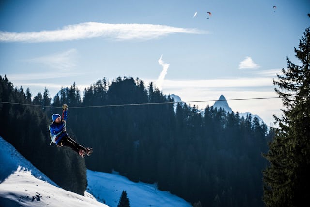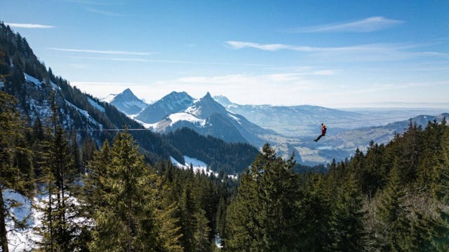 An einer Seilrutsche hoch über dem Boden durch die Luft zu sausen, ist ein besonderes Abenteuer. Im Tal der Seilrutschen in Charmey warten zwischen der Bergstation Vounetz und der Mittelstation gleich neun Ziplines mit bis zu 300 Metern Länge auf alle Adrenalin-Fans. Das Beste daran: Der Parcours ist das ganze Jahr über geöffnet. Ebenso ist dank erfahrener Guides vor Ort stets für Sicherheit gesorgt. Wichtig: Die Aktivität ist für Personen mit einem Gewicht zwischen 40 und 120 Kilogramm zugänglich. Die Anwesenheit einer erwachsenen Person ist obligatorisch.